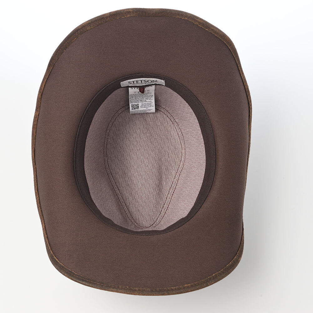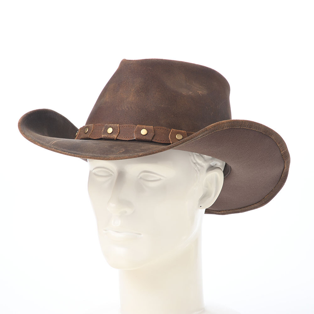重厚で存在感たっぷりな牛革(ヌバックレザー)を使用したウェスタンハット。サイドアップブリムとビンテージ加工で、クラシックなカウボーイルックを体現するスタイル。