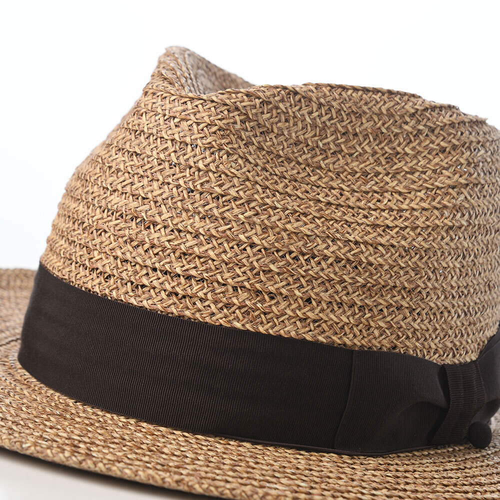 ビンテージで味のある色合いの繊維を、ざっくりと通気性よく編み上げています。フラットなロングブリムで日射しをしっかりよけます。ウィンドキャッチャー付きです。
