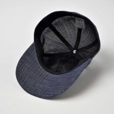 ツバの刺繍が印象的な、渋め色柄のキャップ。伝統の「からみ織り」でメッシュ仕立ての帽体は、風通し抜群。