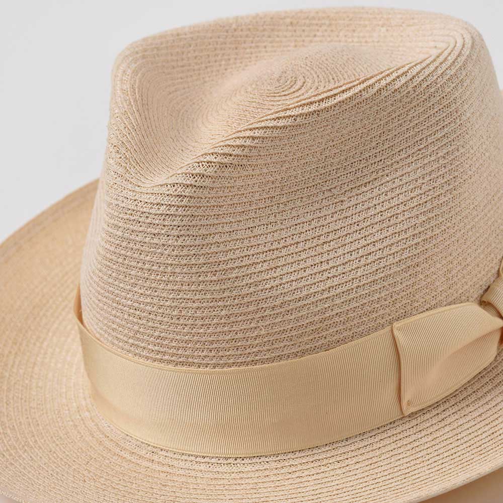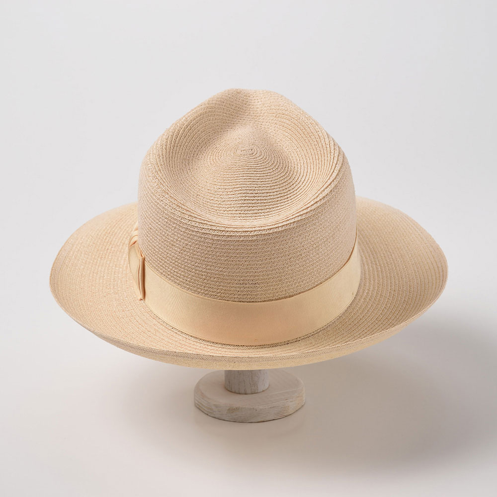 少し角張ったフォルムに広めのブリム(つば)がステットソンらしい、ヘンプ素材のフェドラハット。リボンはあえて本体と同系色。コーディネートを選ばない一品です。
