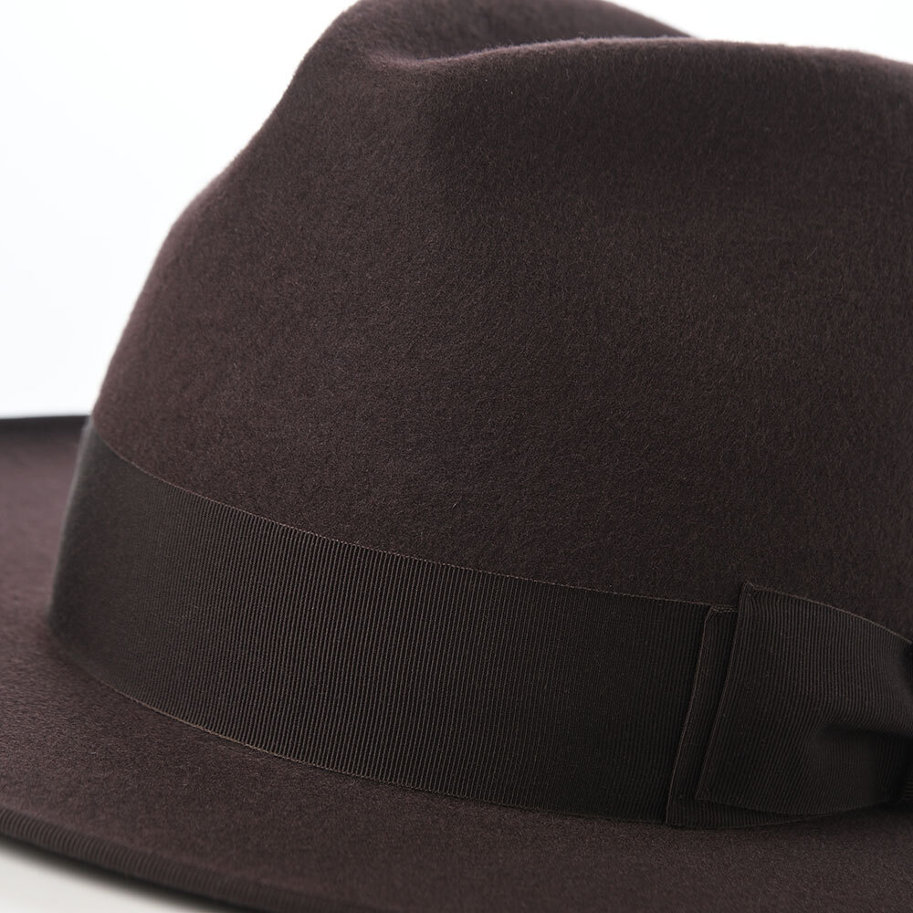 ロングフラットブリムならではの、洗練されたスタイリッシュさが特長のフェルトハット。トップはセンタークリース型ですが、日本製でフィット感がいい点も魅力です。