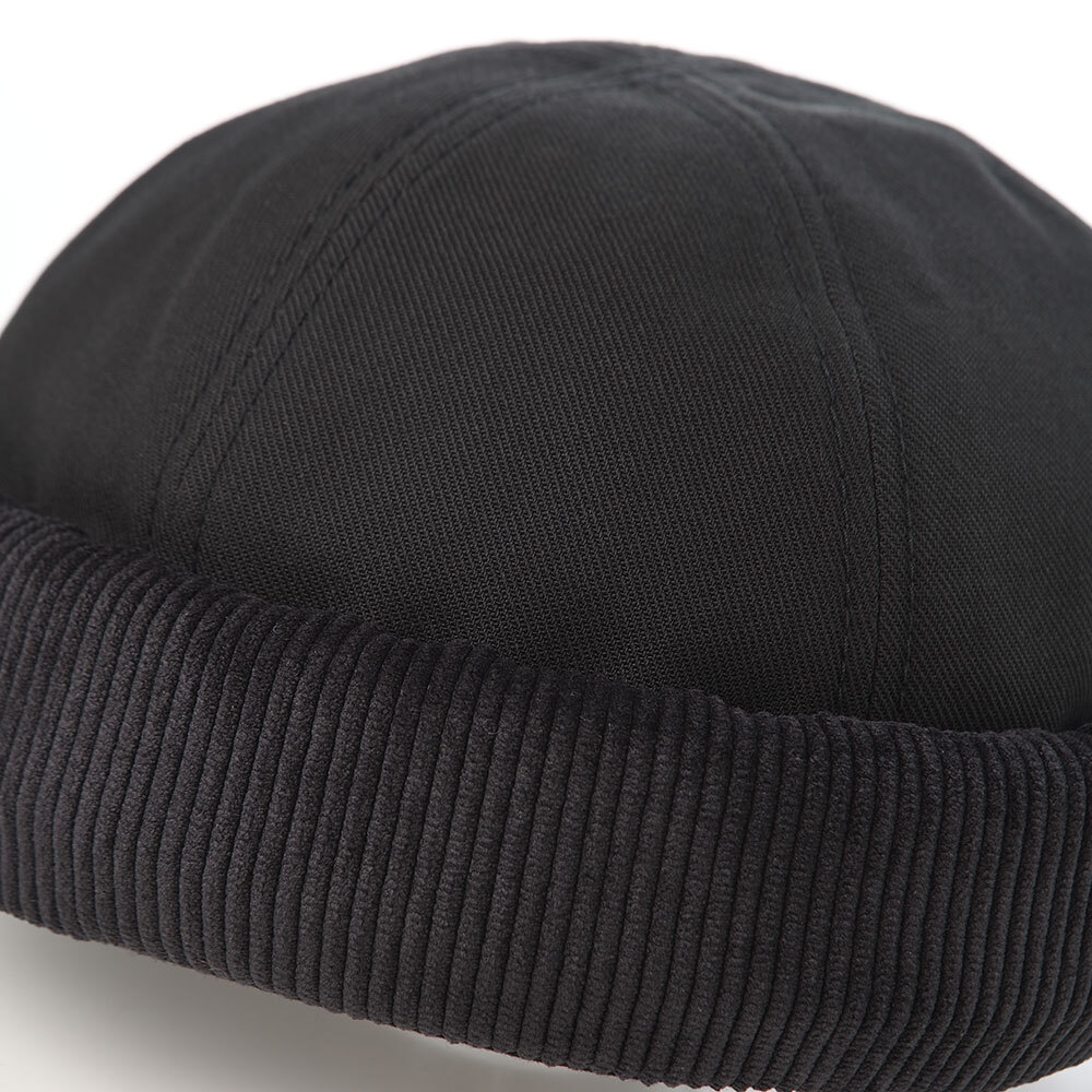 クラウンをツイル地、折り返しをコーデュロイで仕立てたロールキャップ。バックのアジャスターでサイズの微調整可。