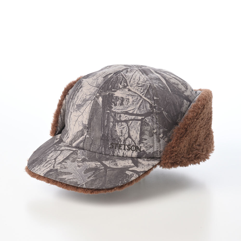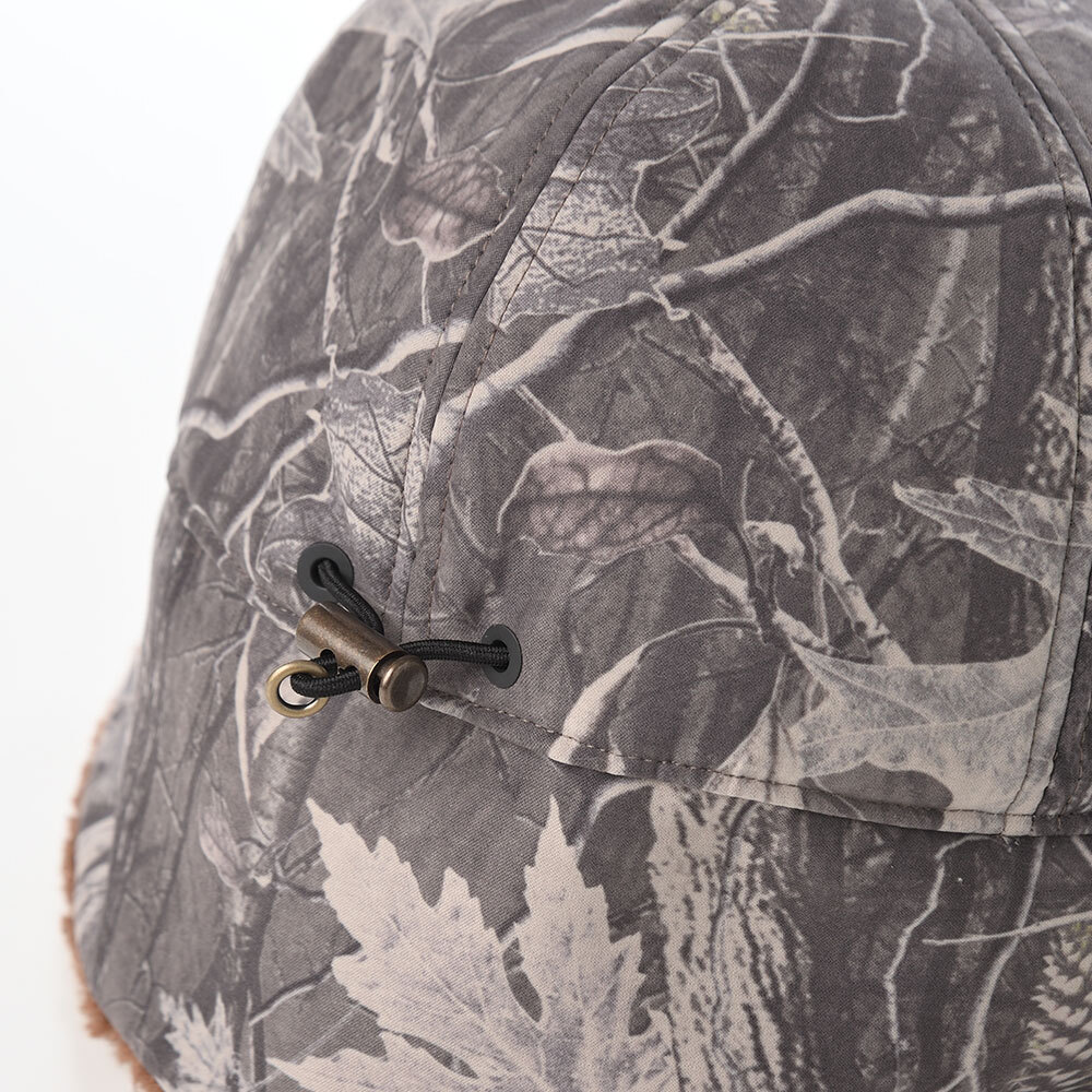 表面はリーフカモフラ柄プリントの撥水生地、裏面は保温性に優れたモフモフのファー。耳あては上げ下ろし可能で、その日の天候に応じてリバーシブルで楽しめるキャップ。