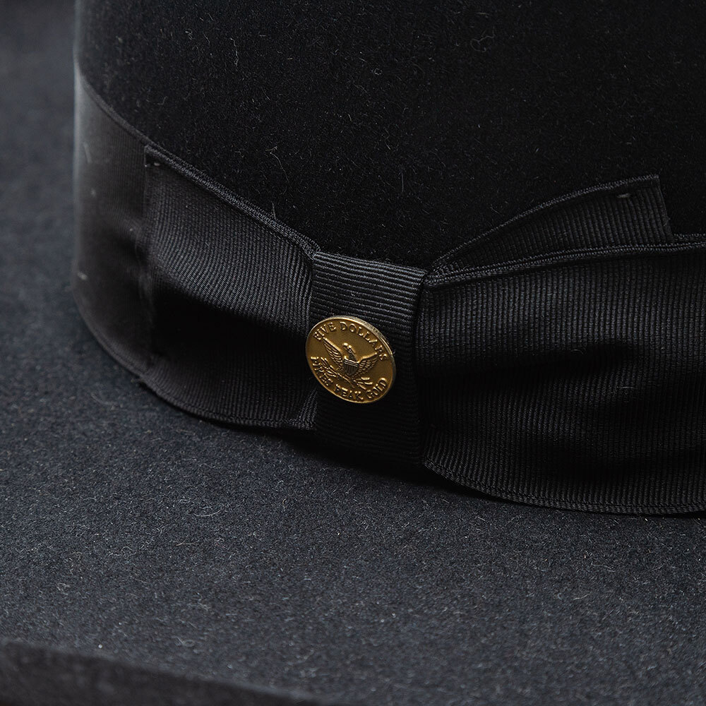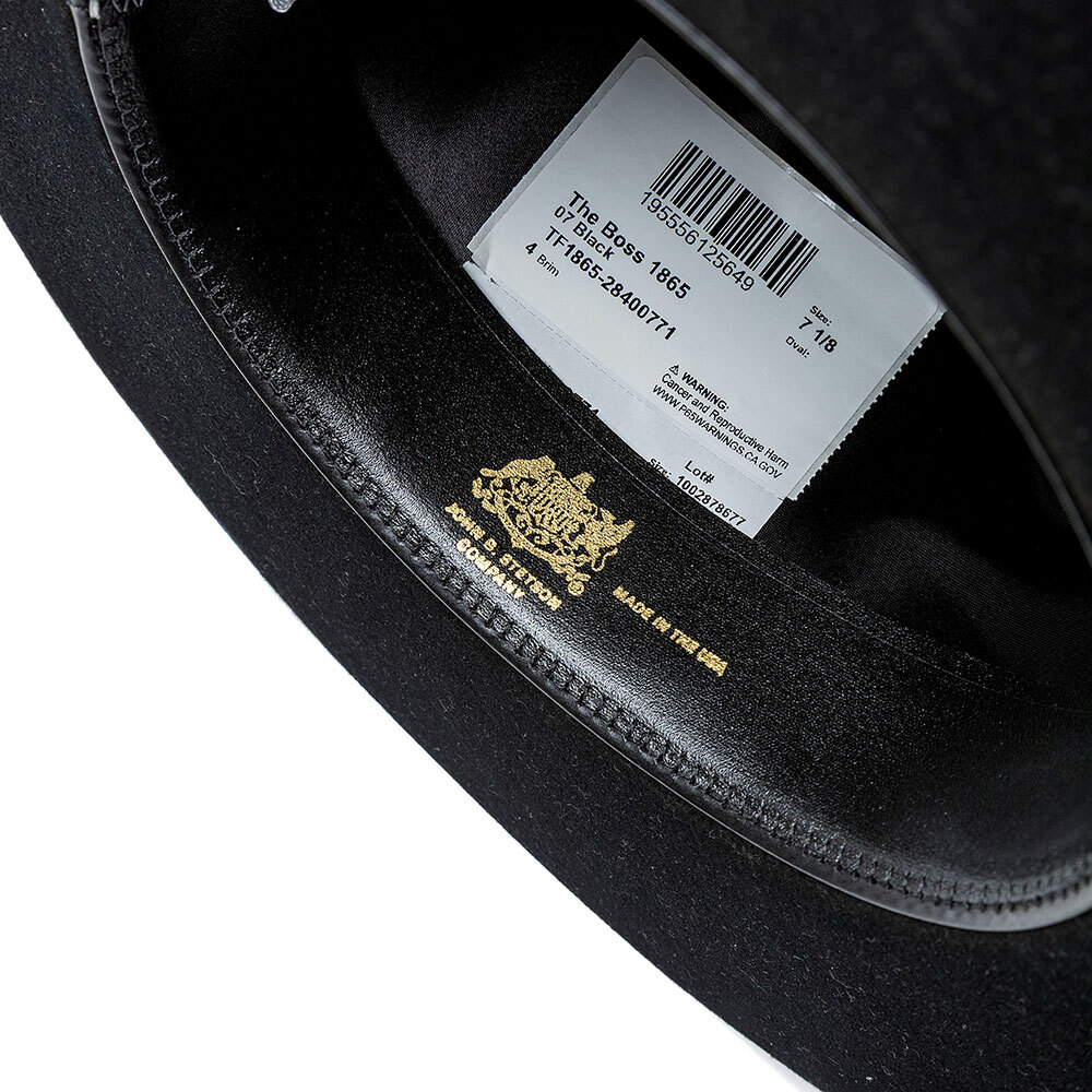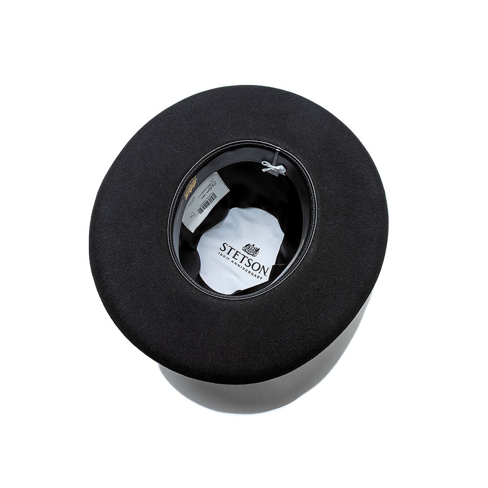 古き良き名品The BOSS 1865を復刻した、オープンクラウン仕様のラビットファーフェルトハット。装飾に5ドル金貨ピンを配した、STETSON160周年限定のUSA製モデル。