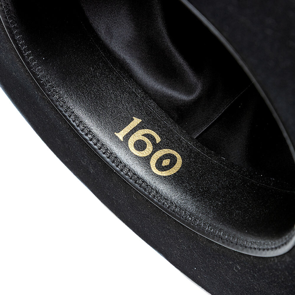 帽子内側には、オリジナルロゴ箔プリント入りの革スベリを採用。装飾として、5ドル金貨ピン、天裏プリントを備えています。STETSON160周年に合わせたデザインです。